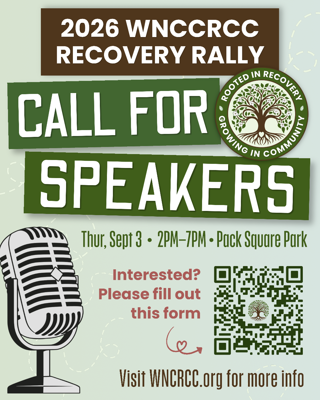 We are looking for speakers at this year’s WNCRCC Recovery Rally on Thursday, September 3rd at Pack Square Park!